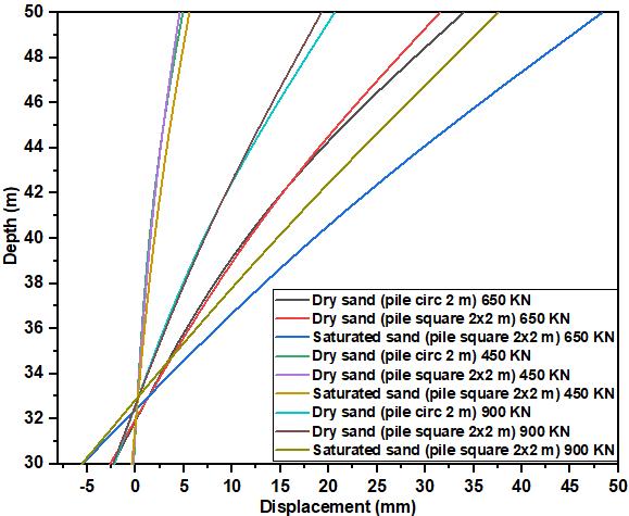 Fig.2a shows the deformation pattern of a square pile in saturatedsandunderstaticlateralloadof650KN,450KN and900KN(preandpost)cyclicdependingonthegeometry of piles (circular or square) in dry soil. The square pile in saturated sand has large deformations of 48.31 mm comparedtothecircularandsquarepileswhichareabout 33.96mmand31.50mmindrysoil.Thedeformationisless thantheheadaftercyclicloadinginbothdryandsaturated soilconditions.Foranappliedloadof450KNand900KNat the pile head (circular and square), gives a difference in displacementof18.01%and48.77%betweenthetwosoil characteristics(dryandsaturated).Evenwhenincreasingthe finalloadto900KN,