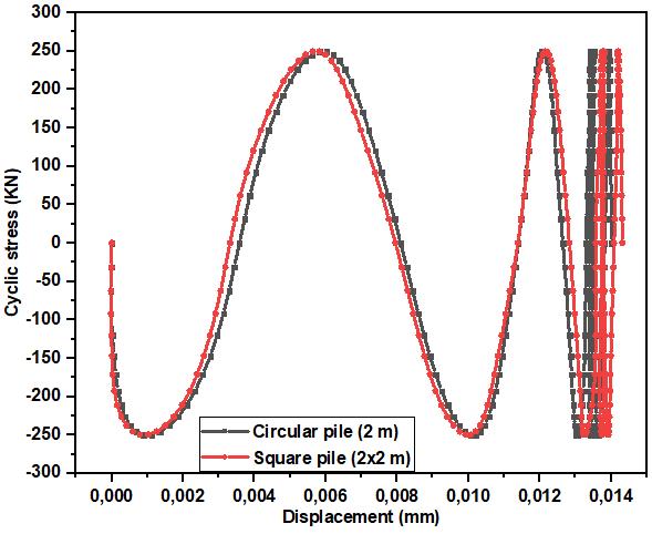 Fig.1dshowsthecyclicstress-displacementbehaviourasa functionofthegeometricshapeofthepile.Thesquarepile showsamoreexcessivedisplacementthanthecircularpile. Thedifferenceindisplacementbetweenthetwotypesofpile is0.0140mmand0.0143mmrespectively,i.e.apercentage