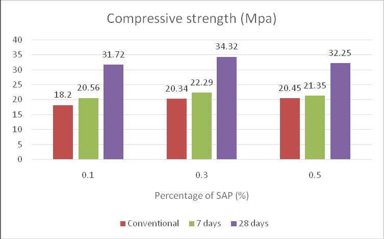 Fazhon wang (2009), The water entrained by SAP in this study is nearly depleted after 7 days, creating many pores in the paste structure. But it causes AS, internal relative humidity, and strength. When applying a high dosage of SAP or entrained air, the compressive strength decreases. The compressive strength of SAP concrete reaches 24.7 N/mm2 after three days and 51 N/mm2after28days.FlexuralstrengthofSAPconcrete at 3 days was 5.6 N/mm2 and at 28 days was 9.6 N/mm2.