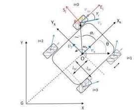 The configuration parameters and system velocities are defined as follows: ��, ��, ��, robot’s position (x, y) and its orientationangleθ(TheanglebetweenXand����);XGY, inertial frame; x,y are the coordinates of the reference pointOintheinertialbasis; ��rO��r,robot’sbaseframe; Cartesian coordinate system associated with the movement of the body center; ���� ���� ����, the coordinate systemofithwheelinthewheel’scenterpoint����;O,����, theinertial basisoftheRobotinRobot’sframeand ����= {������,������}thecenteroftherotationaxisofthewheel��; isa vector thatindicatesthedistance between the Robot’scenterandthecenterofthewheel��th;������,������,������, halfofthedistancebetweenfrontwheelsand������halfof thedistancebetweenthefrontwheelandtherearwheels ����,thedistancebetweenwheelsandthebase(centerofthe robotO);����,denotestheradiusofthewheeli(Distanceof the wheel’s center to the roller center) ���� , denotes the radiusoftherollersonthewheels.����,theanglebetween O���� and XR ; ���� , the angle between S i and XR ; ���� , the angle between ������ and ���� ; ���� [rad/s], wheels angular velocity;������[��/��],��=0,1,2,3∈��,isthevelocityvector correspondingtowheelrevolutions ������,thevelocityof the passive roller in the wheel i; [������ ������ ωi ] T , Generalizedvelocityofpoint����intheframe������������;[������ ������ωi]T,Generalizedvelocityofpoint ����intheframe ����������;��x,��y[m/s]-Robotlinearvelocity;����[rad/s]Robotangularvelocity;