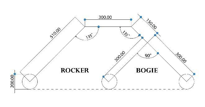The length of DO is equal to the difference between the heightoftriangleADEandthebisectheightfromthebase, DOisequalto148.49mm.UsingTrigonometricEquations, XO is equal to 148 49 mm, OY is equal to 148.49mm Therefore,XYisequalto300mm ByalltheCalculations andDataobtained,weconstructtheRockerBogieLinks dimensions