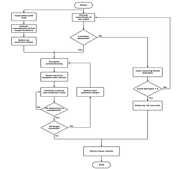 Inthisrobotweusealuminummaterialisusedforthebase platebecauseitisrigidandlightinweightandsteelmaterial forthelegstomorestableonroad.Weuse4motorsonthe frontandbackwheels.Onthetopoftherobot,weput the LIDARsensortogiveamoreaccuratereading.Motordrives areconnectedtothe4DCgearedmotorswhichareoperated at12voltsand100rpm.Themotordriveriscontrolledbya microcontroller,whichprovidesinstructionstothemotors accordingtothecommands.Theelectricalcomponentsare poweredbytwobatteries12V.Thewheeldiameterchosenis 10cmtosatisfytheefficienttravelingofthevehicleandit’s mostlyusedasastandardsizewheel.Thisisanautonomous systemwithnohumanintervention,whichhelpstheuserfor more accurate decisions. The flowchart of the robot operationsisshowninFigure2.