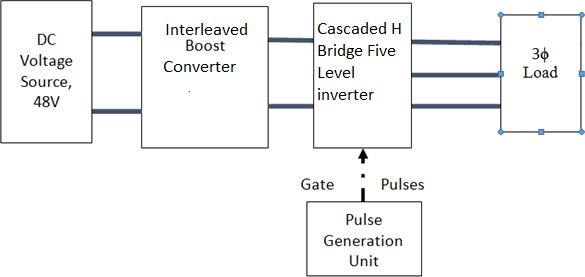 Inthis,thedcvoltagesourceisprovidedforinterleaved boost converter in which the source voltage is getting boosted and provided to H-Bridges individually in the five level Cascaded H-Bridge Multi Level Inverter (CHBMLI) connected to R load. The losses are less in theabovementionedsystemcomparedtoconventional system as the current stress in dc-dc converter switch is reduced due to interleaving of the converters and voltagestressacross theinverterswitchesarereduced as it deals with only half the system voltage. Total power losses of the inverter, based on conduction loss andswitchingloss,areprovidedbelow: