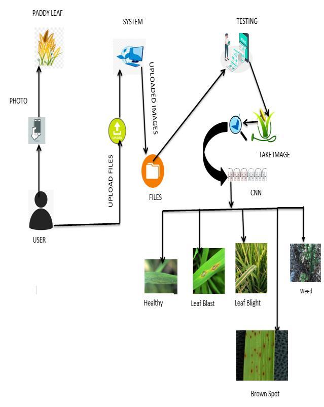 The architecture of Paddy crop disease detection displays the how image is processed using algorithms andhowusergettheaccurateoutput.