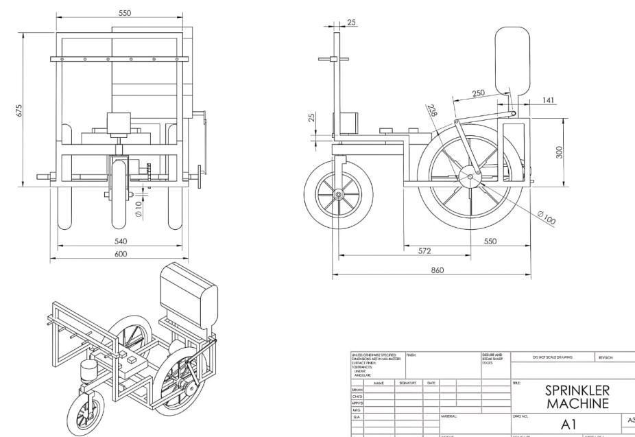natural preparation are used to kill insects or otherwise controltheirreproduction.Theseherbicides,pesticides,and fertilizersareappliedtoagriculturalcropswiththehelpofa special device known as a "Sprayer," sprayer provides optimumperformancewithminimumefforts.Theinvention of a sprayer,pesticides,andfertilizers,bringrevolution to the agriculture or horticulture sector, especially by the invention of sprayers,enabling farmers to obtain the maximum agricultural output. They are used for garden spraying,weed,andpestcontrol,liquidfertilizing,andplant leafpolishing.Therearemanyadvantagesofusingsprayers suchaseasytooperate,maintainandhandle,facilitatingthe uniform spread of the chemicals at the desired level precision-madenozzletipfortheadjustablestream, and capable of throwing foggy spray, light or heavy spray, depending on the requirement. The agricultural sector is facing problems with capacity issues, shrinking revenues, andlaborshortagesandincreasingconsumerdemands.The prevalenceoftraditionalagricultureequipmentintensifies these issues. In addition, most farmers aredesperately seeking different ways to improve the equipment quality whilereducingthedirectoverheadcosts(labor)andcapital. Thusasignificantopportunityrestswithunderstandingthe impact of a pesticide sprayer in an agriculture field. A pesticidesprayerhastobeportableandwithanincreased tank capacity as well as should result in cost reduction, labor,andsprayingtime.Inordertoreducetheseproblems, thereisanumberofsprayersintroducedinthemarketbut thesedevicesdonotmeettheaboveproblemsordemandsof thefarmers.Theconventionalsprayerhasdifficultiessuchas itneedsalotofefforttopushtheliverupanddowninorder tocreatethepressuretospray.Anotherdifficultyofpetrol sprayers is to need to purchase fuel which increases the running costof the sprayer. In order to overcome these difficulties,Ihaveproposedawheel-drivensprayer,itisa portabledeviceandnoneedforanyfueltooperate,whichis easytomoveandspraysthepesticidebymovingthewheel. Themechanisminvolvedinthissprayeristhereciprocating pumpandnozzleswhichwereconnectedatthefrontendof the sprayingequipment. Indian farmers now employ outdated pasties and spraying techniques, which wastes pesticidesandcouldhavenegativehealtheffects