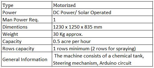 India is a global agricultural powerhouse. Approximately 70% of our population is dependent on agriculture. Agriculture accounts for one-third of our national income.Our economy is based on agriculture. The development of agriculture has much to do with the economic welfare of our country. Although we are a developing country, we do not use technology to improve our agriculture. So we have to fabricate some machines whichcanbehelpfultofarmerssoastoincreasetheirprofit, productionandtosavetheirtime.Pesticidesprayingisone ofthechallengesafarmerusuallyfaces.Presently,farmers havetocarrypesticidesontheirshoulders,andsprayersare operated manually. To overcome this problem, we have designedasmallfourwheelmachinewhichhasthecapacity to carry up to fifty liters of pesticides. This machine is electronicallyoperatedthroughwirelessremotecontrol.The entire machine is powered by a DC battery. The machine consists of the main body frame, battery, DC Motor, Gear Motor,Wipermotor,Wheels,TankandminiatureCentrifugal Pump. It consists of four wheels. The back wheels of the machineareoperatedbytheDCwipermotor.Frameismade up of mild steel. Blowers are attached at a certain height fromtheframe.Theblowerheightcanbeadjustablesothat itcanbeusedfordifferentcrops.Theblowerisoperatedby ahighspeedDCmotorthatdrawsthewaterfromthetank and sprays it out. This gear motor rotates the blower through 180 degrees so that the pesticide can be evenly sprayedonbothsidesofthefield.Thetankislocatedonthe frontoftheframe.Thetransmitterandbatteryiskeptnext tothebattery.Thesupplytoallthemotorsandtransmitter isprovidedbyabya7ADCbattery.Initially,thereceiveris turnedonwhenthebatterysupplyisturnedon.Here,weare usingafour-channelRFreceivermodule(i.e.,wecancontrol fourmotorssimultaneously).Relaysand12vDCsuppliesare used to connect each channel to the motors. Receiving a signalfromthetransmitter,thereceiversendsacommandto therelay,whichoperatesthemotor,andthemotorswitches on.Inthisproject,channelAisconnectedtothewipermotor WhenchannelAisselectedinthetransmitter(asshownin theblockdiagram),thewipermotorispoweredON.Itdrives thebackwheelsofthemachineandthemachineproceeds tomoveforward.ByselectingchannelB,thegearmotoris turnedonanditstartsrotating.Bysimultaneouslyturning onallthreenozzlechannels,themachinestartsmovingand sprayingfrombothsides.