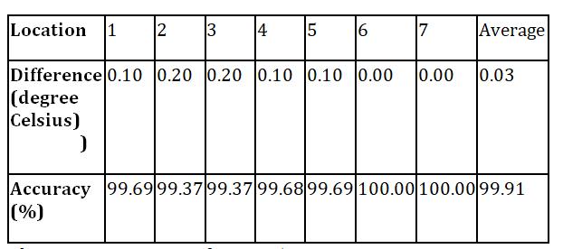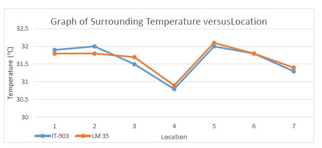 From above Table, the average accuracy for LM35 temperature sensor to measure the surrounding temperature is 99.91% and the largest deviation in measurementis0.20℃.AgraphofSurroundingTemperature versusLocationisplottedandshowninFigure-3.Thegraph showssmalldeviationbetweenthemeasurementIT-903and LM35.