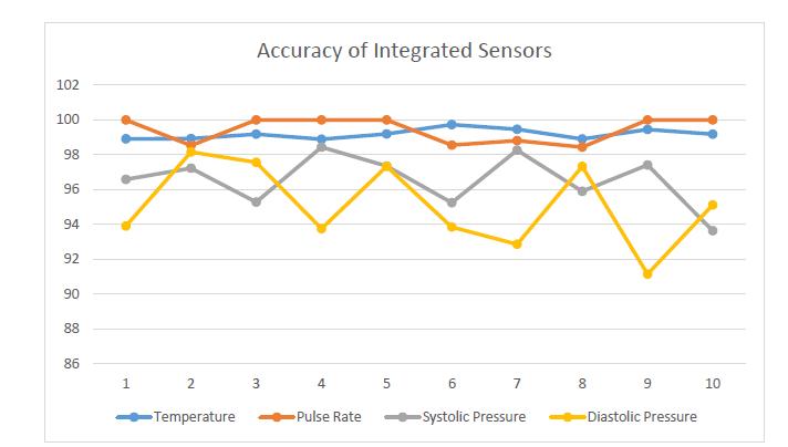 The accuracy of each sensor remains above 90% for the measurements.Theaverageaccuracyforthetestis99.4% forLM35,99.46%forECGsensormoduleandabove99% for integrated blood pressure monitor. The accuracy for LM35andECGsensormodulehaslessdeviationcompared totheintegratedbloodpressuresystembasedonthegraph plottedinabovegraph.TheLM35andECGsensormodule havehigheraccuracywheretheiraccuracyisabove98%for everymeasurement. Themeasurementfromtheintegrated bloodpressuresystemhasdeviationliedbetween±7mmHg and the largest error is 8.86%. The error could be due to body movement during measurement and other environmentfactor.