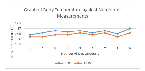 FromTable-3,theaverageaccuracyforLM35temperature sensor to measure body temperature is 99.21% and the largest error in measurement is 1.09 %. According to the graphplottedinFigure4,themeasurementsfromIT-903are alwayshigherthanthemeasurementsfromLM35.