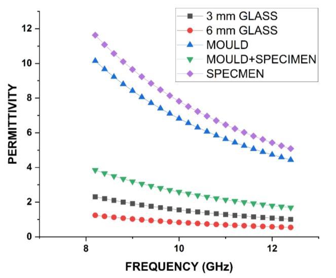 Fig -6: PermittivityvsFrequencyformould,flexiglassand Specimen