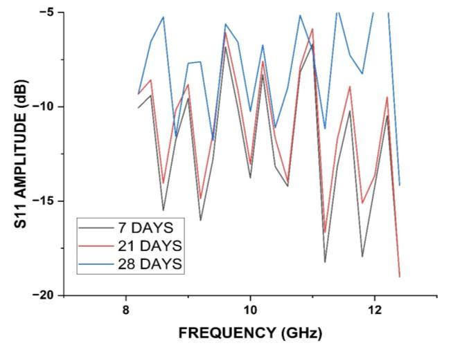 S11amplitudewasalsoobservedfordifferentcuringdays. As from figure 10 we can conclude that S11 amplitude increaseswithcuringdays.