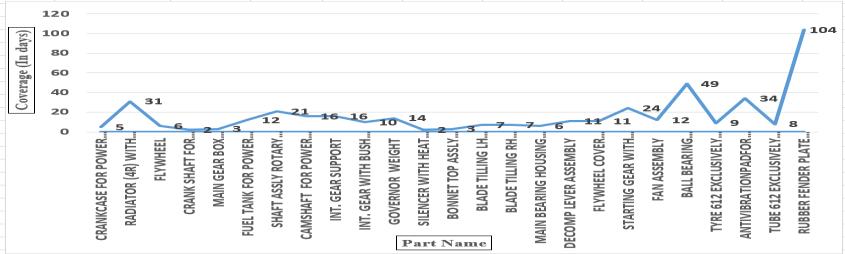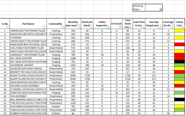 TheExcelsheetrepresents,onedaystatusof25partsinthat therearecolumnssuchasPartnamewhichrepresentspart name, commodity which represents the part is which Commodities, Month plan which represents the monthly requirementofeachpart,takenfromMRP,nextcolumnis Stock(onhand),Underinspection(UI),Intransitthoseare takenfromtheERPsoftwareandafterthatmakingtotalof thosethreecolumnswhichisTotalstocklevel.Leadtimeis differentforparts,thenextcolumnisOnedayrequirement ofpartthatiscalculatedfrom,inonemonththedaysare30 (Working days) so, we can calculate by Monthly plan to workingdays.Afterthatthesecondlastcolumniscoverage ofparts(Indays),whichiscalculatedfrom,Totalstocklevel to One day requirement. The last one column is very