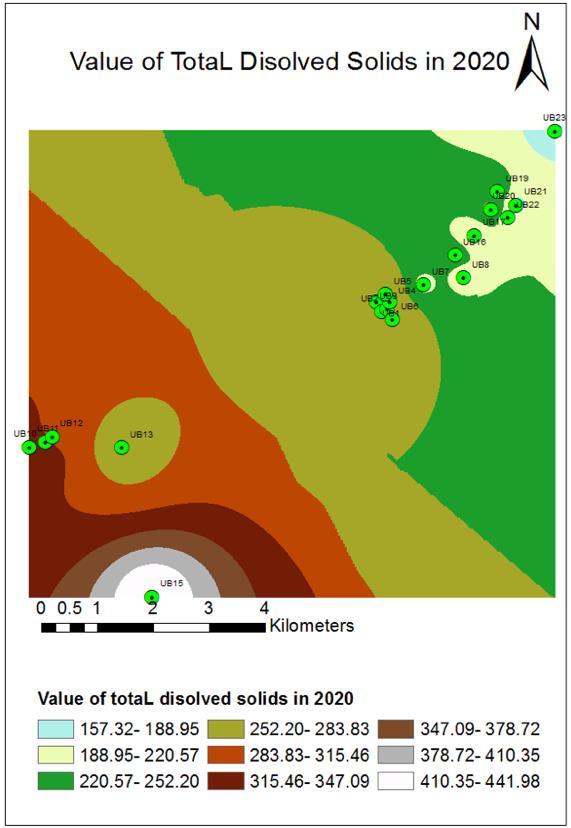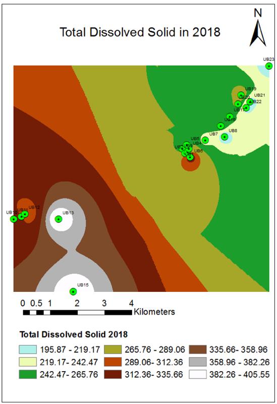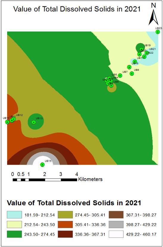 Figure4.Thevalueoftotalhardnessoverthestudyareafrom2018to2021. Thevalueoftotaldissolvedsolidswasintherangeof195to405mg/litintheyear2018butitisincreasedupto430to460 mg/litintheyear2021intheareaasshowninFigure5.