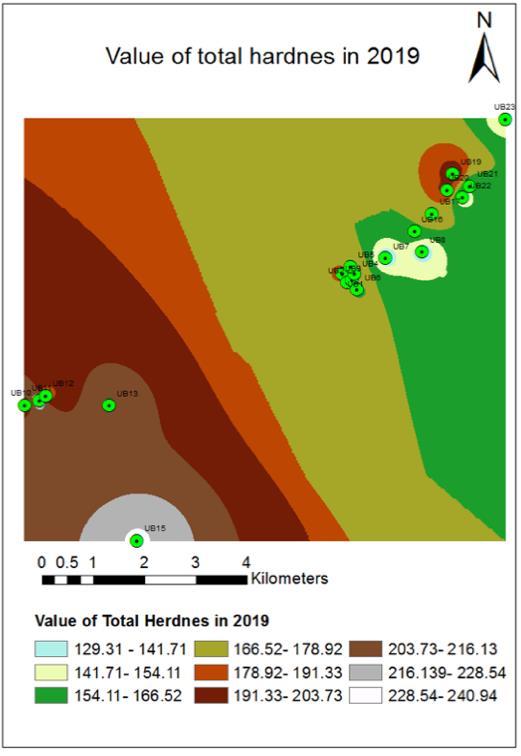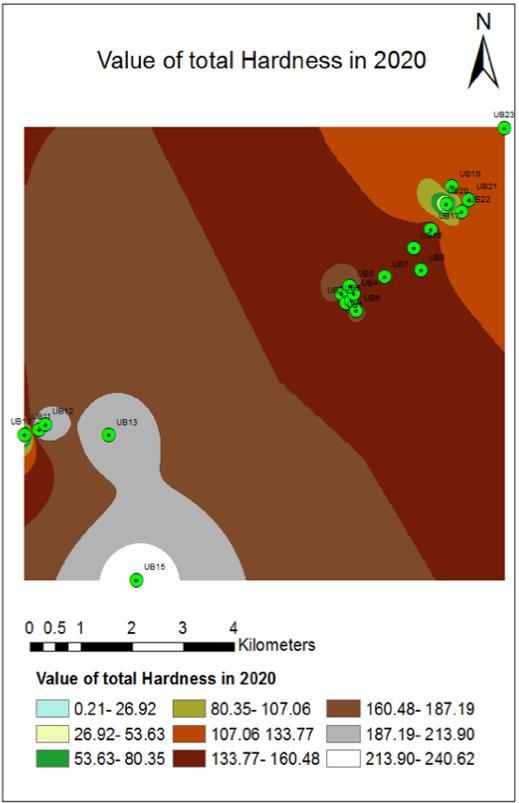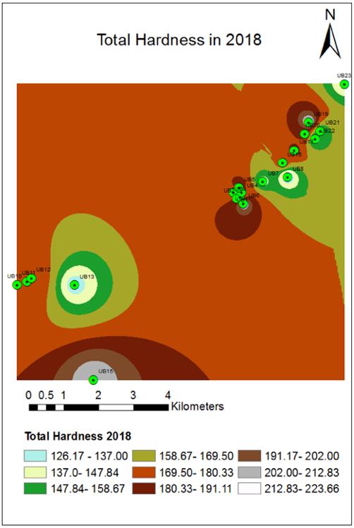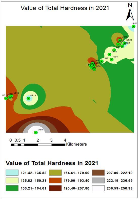 Thevalueoftotalhardnesswasintherangeof126to234mg/litintheyear2018butintheyear2021ithasincreasedupto 460mg/litathighersideasshowninFigure4.