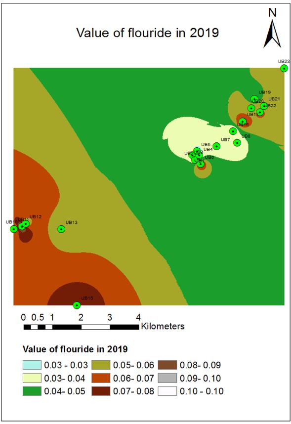 The value of fluoride was in the range of 0.03 to 0.32 in the year 2018 and changed in the range of 0.06 to o.67 mg/lit as showninFigure6.