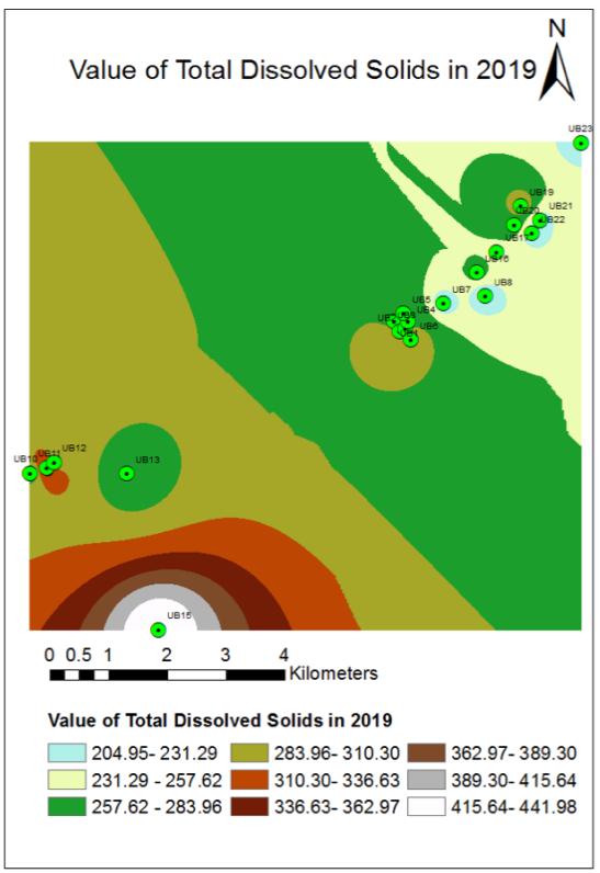 Groundwater samples were collected from 20 wells situated in Al Zoroub and Al Buraimi city. These samples have physical andchemicalparameterlikeBicarbonateAlkalinity,Calcium (Ca++),Chloride(Cl-),Magnesium(Mg++),TotalAlkalinity,Total hardness(CaCO3),Total Dissolvedsolid(TDS),pHvalue,Fluoride(F),Sodium(Na)etc.In thefirststage,thestudyarea was finalised to collect the groundwater quality samples by selecting the 20 wells in the Al Zouroub and Al Buraimi area. The satellite image was captured from Google earth to locate the wells. Thereafter, image was georeferenced in the Arc GIS softwareandwellsdemarcatedonthesatellitedimage.Thevalueofallparameterswasattributedwithrespectivewells.Inthe laststage,the(IDW) methodofinterpolationisapplied togeneratethethematicmapinArc GISsoftware All thematicmaps andgraphsweregeneratedwhichshowsthetrendsofgroundwaterqualityparameterswitharialextentintheAlZorouband AlBuraimiregion(Figure2).