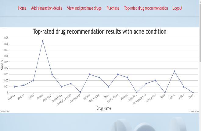 The transaction is detected as fraudulent transactions if and only if the result from both models are judged as fraudulent transactions. The consistency of judgment on fraudulent transactions reduces the probability of misjudgment of normal transactions, and ensures that it has better performance than a single model, i.e., the population model or individual model. For different performance objectives, other combinations can be also tried, which will be reserved for future research. This segment contained the expectation results produced by our proposed AI based drug proposal framework. Our framework can effectively suggest the first class and best medication to the clients of the framework. In any case, clients can without much of a stretch question at our framework for the proposal, which medication is best for torment, circulatory strain and some other related sicknesses condition. The patients can straightforwardly inquiry to our framework by utilizing our client application and other drug clients like drug specialists, specialists and clinics can likewise utilize this framework utilizingtheircredentials.Fig3 representsthemedication suggestion results from our proposed framework on the premise of hypertension condition. The medication name with their mean qualities for hypertension is introduced. Our framework can effectively suggest the top of the line and best medication to the clients of the framework. For the medication suggestion, anybody might utilize our framework yet for playing out the exchange in our block chain-based framework just the enrolled clients like pharmacy, manufacturer, clinics, specialists and providers are qualified. Patients can likewise look for the better medication and furthermore track the medication hotspot forapprovaleitherdrugisuniqueorphony.