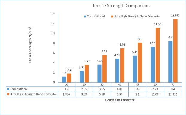 Grades Conventional UltraHigh StrengthNano Concrete 10 15.8 17.69 20 223 2497 30 2738 3066 40 3162 3541 45 3669 4109 60 3872 4336 70 4183 4684