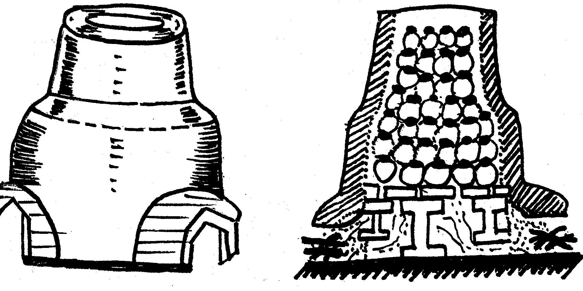 The form of the kiln is essentially a cylinder, openedattopwithanentrancetunnelforthefireprovided at bottom. The floor, on which the wares are placed, is made perforated to let the fire pass Fig.3 Open-top Updraughtkilnupwardthroughthewares,escapingfromthe top. The top of the kiln is covered by broken pieces of wares or tiles. These kilns are 120 cm. to 200 cm. in diameterandthefiremouthis40cm.to60cm.(Fig.3).