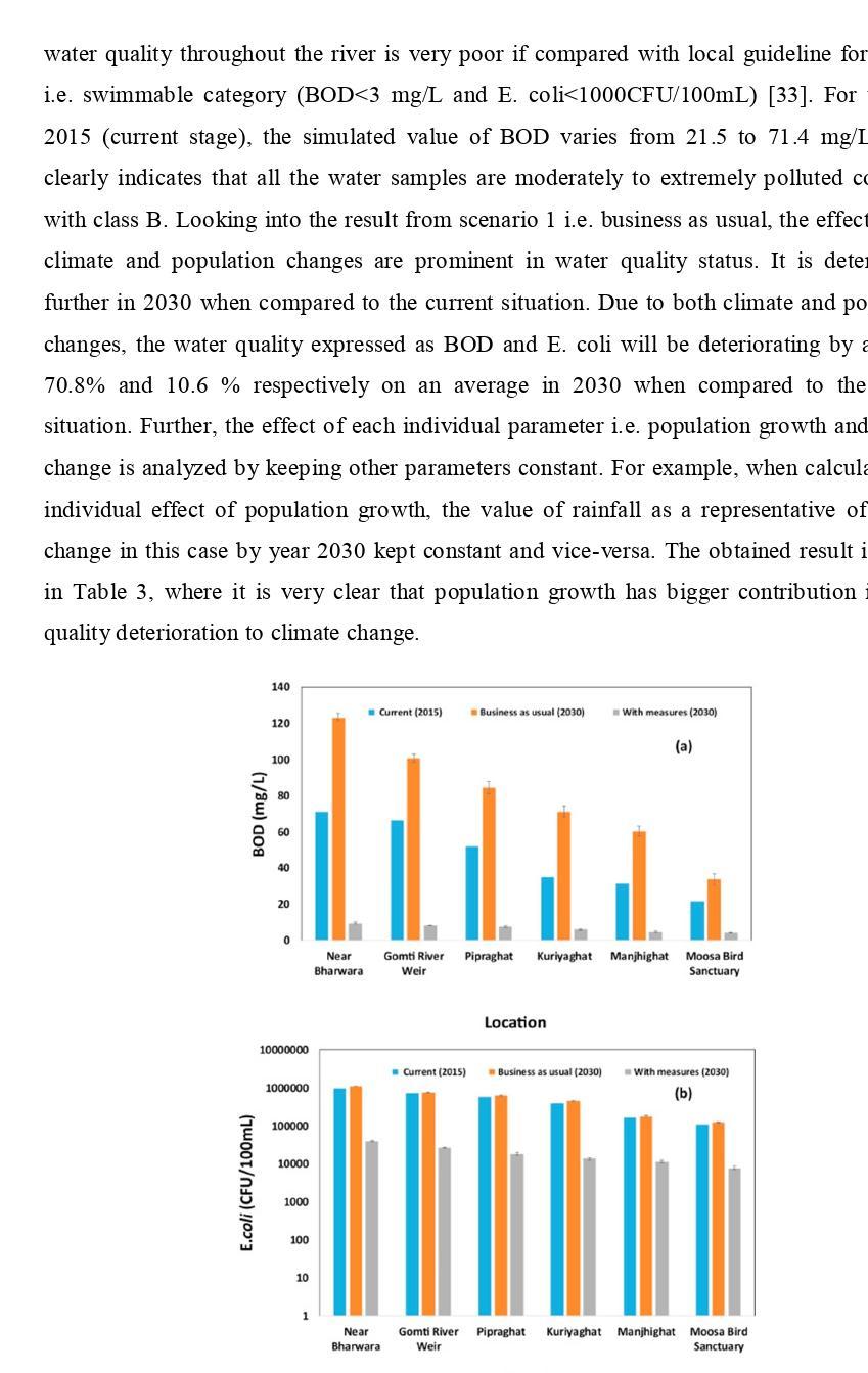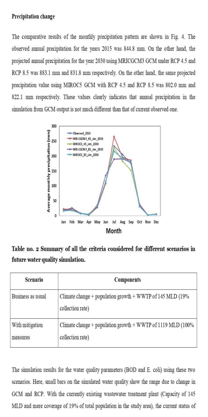 crucial from environmental, aesthetic and business utilizationfactorofview.Henceforth,thisstudiespaintings centered on assessing the cutting-edge as properly as predicting its destiny state of affairs the use of distinctive situations even as thinking about key drivers of world modifications particularly weather extrude and populace growth. Water Evaluation and Planning (WEAP), a numerical simulationtool,turnedintousedtomodel river water excellent the use of situations viz. enterprise as regular (BAU) and state of affairs with mitigation measures. Water excellent simulation turned into carried out alongside 24 km stretch of the Gomti River from downstream of Near Moosa Bird Sanctuary to Near Bharwara. Comparison of simulated water excellent parameters for the cutting-edge and BAU repute virtually shows that the water excellent through 2030 will rapidly becomeworseandmightbenownolongerappropriatefor plentyaquaticlivesinphrasesofsimulatedwaterexcellent parameters. Results from state of affairs with mitigation measures advocate cutting-edge deliberate wastewater remedy plant life and regulations are now no longer enough sufficient to acquire suited river water excellent inside magnificence B and as a result name for fast and inclusiveaction