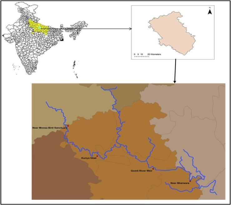 The Gomati river, one of the fundamental tributaries of Ganga river originates close to Mainkot in Gomat Tal approximately three km east of Pilibhit metropolis with insidethedistrictofPilibhitlocatedwith insidetheNorthwestU.P.atanelevationoftwohundredmabovemeansea degree at range 28034' North and longitude 80017' East. The location of foundation is ready 50 km South of the Himalayafoothills.Theriverflowswith insidethebrilliant alluvial undeniable, that's of Pleistocene-Holocene foundation, and redistributes the weathered sediments of the Gangetic alluvial undeniable derived from Himalaya (KumarandSingh,1978).Theriverflowsthruthedistricts of Pilibhit, Shahjahanpur, Sitapur, Lucknow, Barabanki, Sultanpur and Jaunpur, overlaying a complete distance of approximately940kmearlierthanbecomingamemberof the river Ganga close to Udyar Ghat in Kaithi village, district Ghazipur approximately 30 km North of Varanasi. The river is characterised through sluggish float for the duration of the year, besides the monsoon season, whilst heavy rainfall causes a manifold growth with inside the runoff. Most of the sediments are transported during excessive river discharge, in monsoon period. The Gomati river catchment place is approximately 30,437 sq. km. Sai riveris itsfundamental tributaryhaving about 43% of the overallcatchmentplaceofGomatibasin.