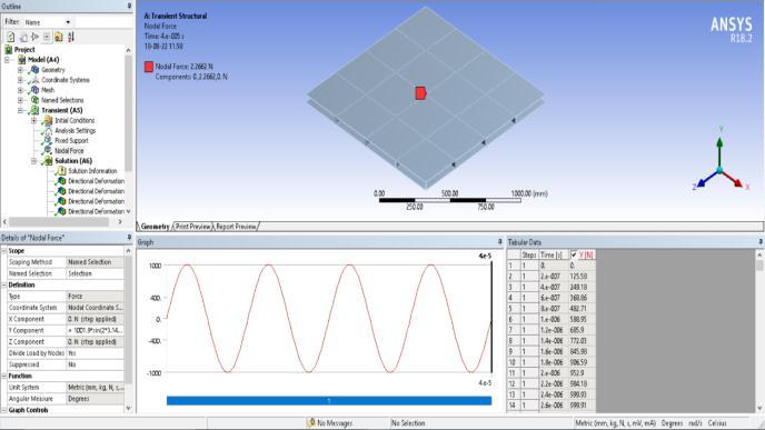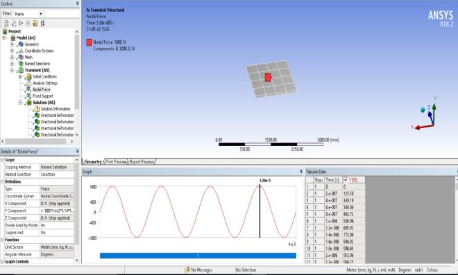 Figureshowstheforceappliedonthealuminiumstiffened sandwich plate having rectangular configuration of stiffeners. Four cycles of sinusoidal load having 1000 N amplitudeand10microsecondscycletimeisconsideredfor thisanalysis.