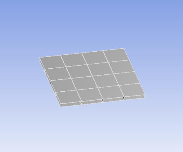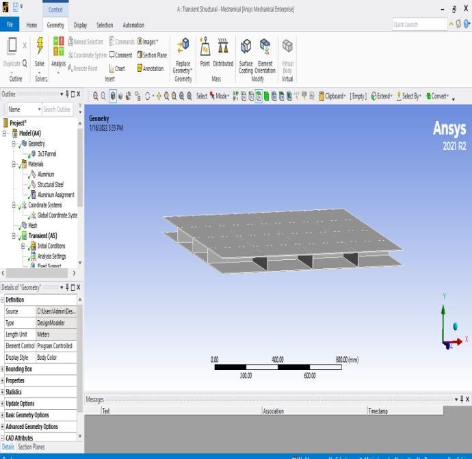 Above figure shows aluminium stiffened sandwich plate havingrectangularconfigurationofstiffeners.Thespacingof stiffenersisconstantwhichis300mminboththedirections. Threestiffenersareprovidedbetweentwoaluminiumplates inboththedirections.