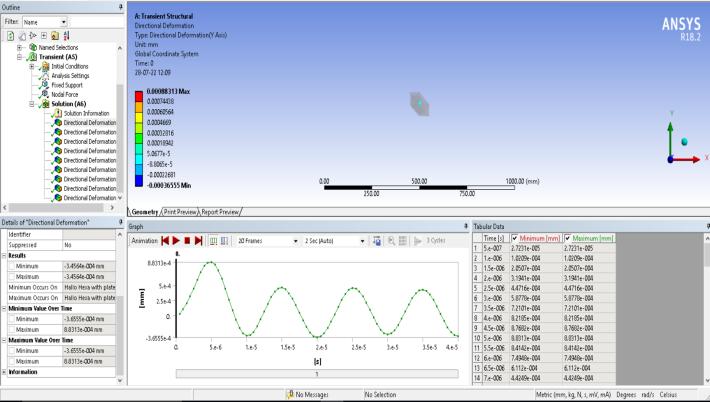 Figureshowsdirectionaldeformationofplateatcentralnode for aluminium stiffened sandwich plate having hexagonal stiffenersfor100KHZfrequency.