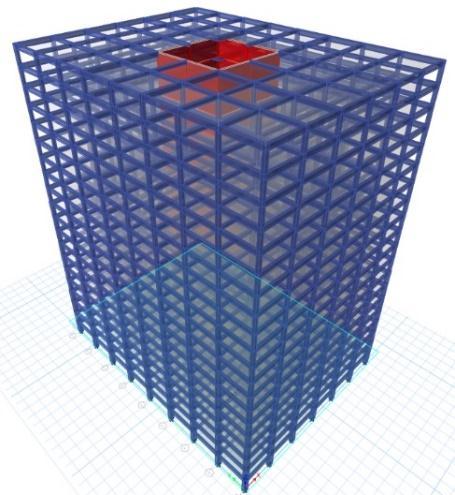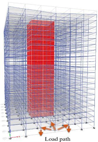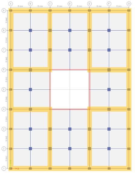 Atypicalreinforcedconcreteframedbuildingof20storeyis modelled in ETABS. This is a rectangular RC building containing6bays,eachof6minX-directionand8bays,each of6minY-direction.Thetypicalstoreyheightis3mandthe basesupportsarefixed.Inaddition,thestructureconsistsof a core and outrigger beams. The outrigger beams extend fromthecoretoperimetercolumnsinhorizontalgrids4&6 andverticalgridsC&Easshowninthefigure.Connectionis formedbetweenperimetercolumnsbymeansofoutrigger perimeterbeams.