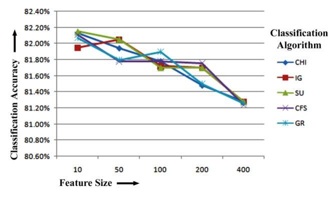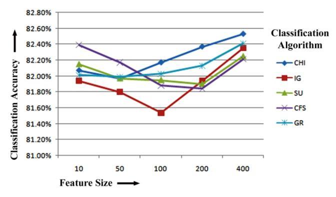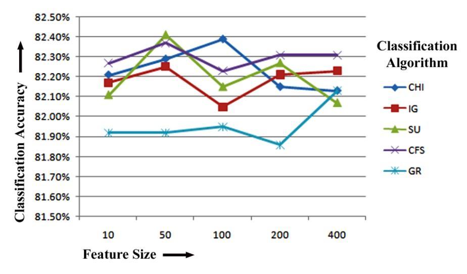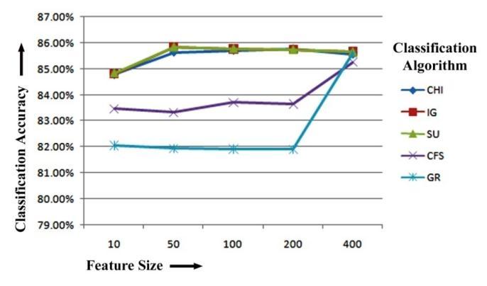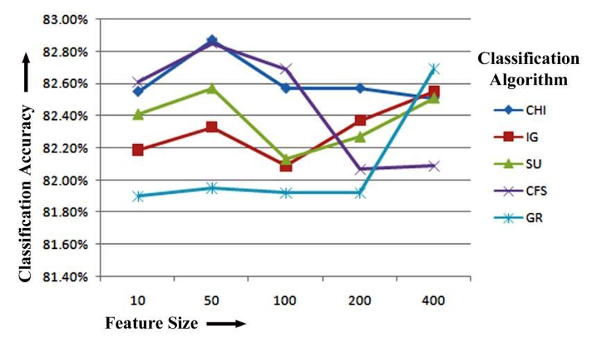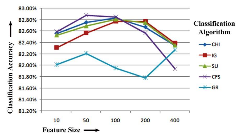 Finally,wecanseefromtheREPTreeclassifier'sresults thatCFShasthehighestclassificationaccuracyof82.27%, 82.31%and82.31%forthetop10,200and400featuresfor unigram feature extraction. Again, while training with REPTreeclassifieron50numbersoftoprankedfeaturesfor unigram feature extraction, SU has the maximum classification accuracy of 82.41%. CHI has the highest classification accuracy of 82.39% when selecting top 100 numbers of features. Figure-5.4 displays the REPTree Classifier-based unigram feature extraction results of five featureselectionmethodsforclassificationaccuracy.