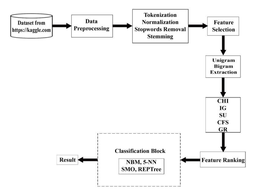 A framework based on unigram and bigram feature extraction is proposed with the goal of improving classification results in order to conduct experiments on twitterdataset.Anon-rankedfeaturecollectionisexamined using5featureselection/evaluationprocedures.Thereare hence five sets of ranked feature sets with various rank orderings. Figure-3.1 demonstrates each component and eachofthestepsthatgointotheproposedframeworkfor creatinganefficientpatterntoidentifysentimentintweets. The first stage is gathering twitter data from the publicly accessible website https://www.kaggle.com. For analysis, unigramandbigramfeaturesweregeneratedfromthisdata by preprocessing and annotation. Five feature selection techniquesareappliedtotheretrievedunigramandbigram featuresfromthedataset,andthetopfivefeaturesetswith various rank orderings are chosen. Then, results are produced using 4 distinct classification algorithms. The results are displayed depending on how well the chosen classificationalgorithmsperformed.