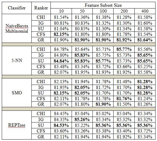 Fourpopularclassificationalgorithmswerelookedatto gauge the efficiency of FS approaches during the classificationprocess.NaïveBayesMultinomial(NBM),5-NN (k-nearestNeighborsclassifierwithk=5;referredtoas5NNinthiswork),SequentialMinimumOptimization(SMO) andREPTreeareallusedunlessotherwisestated.TheWEKA tool was used to create each and every classifier. Support vectormachinesarefrequentlytrainedusingSMO,whichis implementedbythewell-knownLIBSVMutility.KNNsare usedasinstance-basedlearningclassifiers.NBMforBayes' theorem,andREPTreeistree-basedapproaches.Thegoalof the classifier heterogeneity project is to examine the performanceofvariousFStechniques employingunigram and bigram feature extraction on several classifiers with variedfeaturerankingsizes.