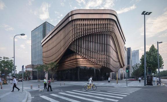 TheBundFinanceCenter,hometotheFosunFoundationin Shanghai,China,featuresafaçadeconsistingofthreelayers ofcurtains,madeofcoppertubesthatareconstantlymoving, reminiscentoftheatrecurtains.