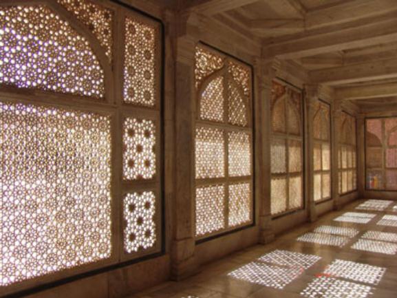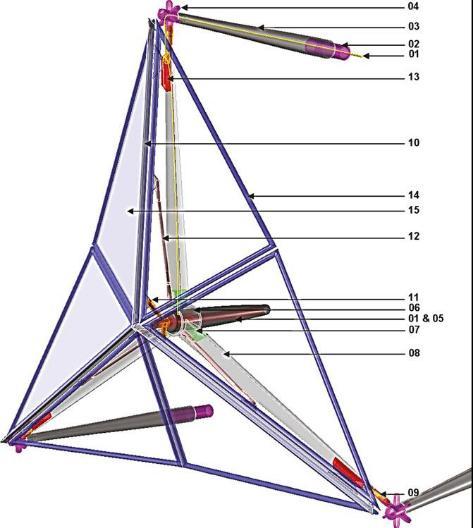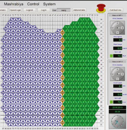 Themashrabiaisspaced2000mmfromthesurfaceofthe glass wall. It has stainless steel supporting frames, aluminiumdynamicframes,andfiberglassmeshinfill.Each unitis4200mminheightandvarying between3600mm and 5400 mm in width. Each unit is sub-divided into six triangularframesthatunfoldthroughacentrallypositioned actuatorandpiston.Thelargestunitweighsaround625kg.