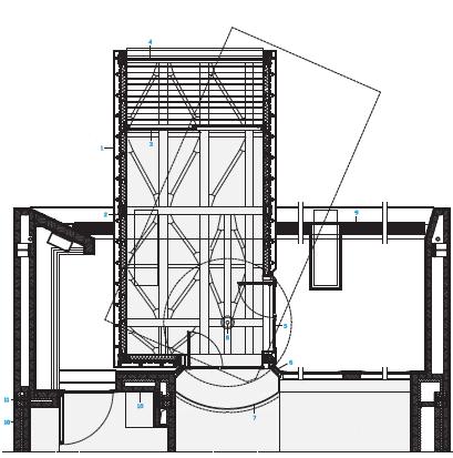 Theseven-storyhighstructurehaseveryotherfloorwitha turningbox,whichallowsforalargerconfigurationofspace. The three boxes, which can rotate individually, resemble drawers that slot into a simple concrete frame, when the rooms are turned horizontally inward, revealing their windowless wooden flanks. The home was designed by IranianarchitectAlirezaTaghaboniofNextOffice,withthe collaborationofalargeteamofassociatesandconsultants forthestructuralandmechanicalaspects.