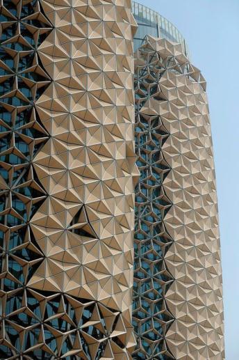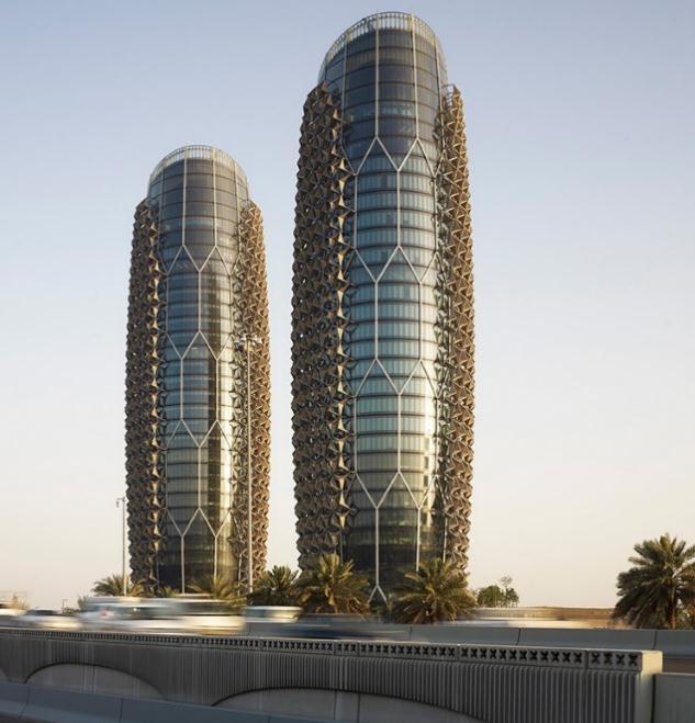 DesignedbyAedasArchitects,thedistinguishingfeatureof thetowersisits’externalautomatedshadingsystem,which consists of numerous umbrella-like glass elements that automaticallyopenandclosedependingontheintensityof sunlight.Inspiredby‘mashrabia’,thegeometricallydesigned woodenlatticescreensusedtofillthewindowsoftraditional Arabicarchitecturesincethe14th century,thefaçadeofthe towersisdynamicallycontrolledbyabuildingmanagement