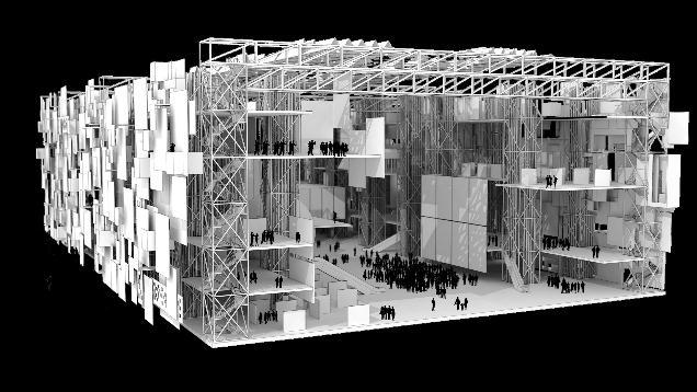 TheShedisessentiallya200,000squarefoot,eightlevelarts space with a telescoping outer shell. The Shed’s design is inspiredbyCedricPrice’sFunPalace,anever-builtdesign, the idea behind which was to create an unenclosed steel structure set on traveling gantry cranes resulting in a moveableformthatwouldallowthepublictocontrol and rearrangetheirenvironmenttohostanarrayofactivities.
