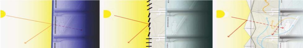 The façade is controlled by a computer for responding to idealsolarandlightsituations.Similartoorigamiumbrellas, theseshadingelementsunfoldtovariousanglesinresponse tothemovementofthesuntooptimizethesolarexposureof thefaçade.