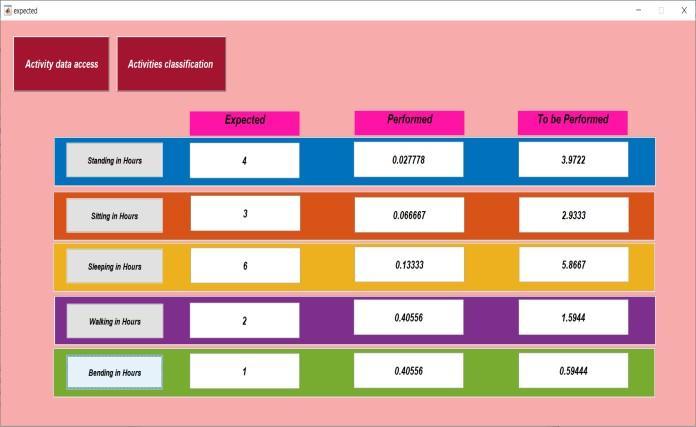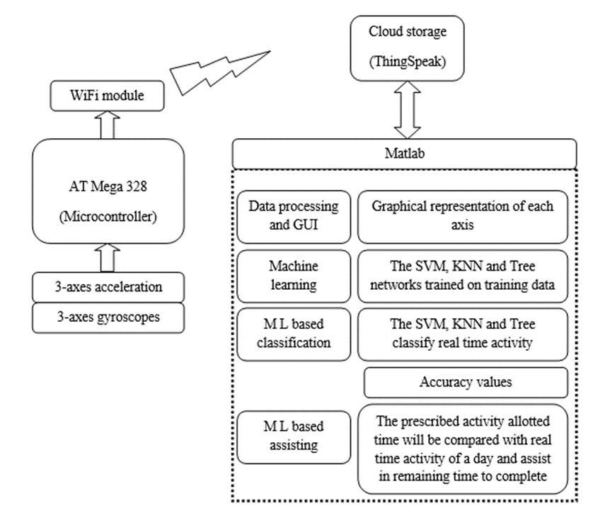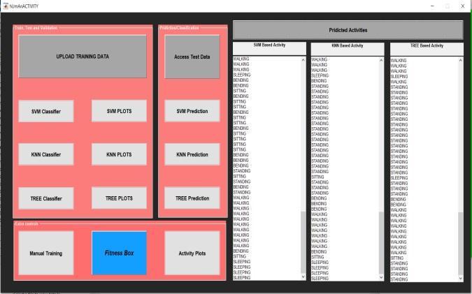 Using machine learning we have trained the system torecognizea specific activityby providingan excel sheet of data having x,y,z value sets different for different activities. Also we have created three Graphical User Interface (GUI) In first GUI, graphical movement of the devicecan beseenin X, Y and Z axis separately In second GUI, comparative classification of activities can be seen, given by three algorithms namely SVM, KNN and decision tree Also, theefficiency of each algorithm can be checked in MATLAB. ThelastGUIisthevisualappearance of the front-end display that that will be accessed by the user