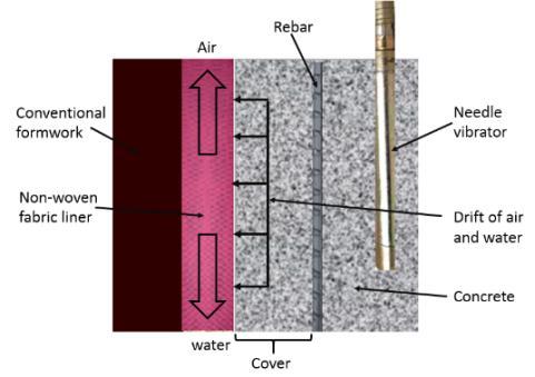 Thedurabilityofreinforcedconcreteissignificantlybased onthequalityofthecoverzone.Thecoverzoneservesas thefirstlinedefenseagainst deteriorationduetophysical or chemical factors Aggressive substances enter the concretethroughitssurfacearea;asaresult,thetransport characteristics of this zone will control the rate of penetration into the concrete's core and, ultimately, how longitwill last[1].However,comparedtotheconcrete in the section's centre, the concrete on the surface is more vulnerabletoimpropercuringandcompaction.Therefore, for durable concrete, a well-compacted, thick, hard, and strong concrete surface zone with low permeability and lowdiffusivityisrecommended.Airbubblesandwatercan drain from the surface of the concrete with controlled permeable formwork, but the cement and fine particles are kept in place. This assures a decrease in the w-c ratio and raises the cement content in the concrete's surface zone. A homogeneous, denser, and less porous concrete surfaceisproducedthroughCPFlining[2].