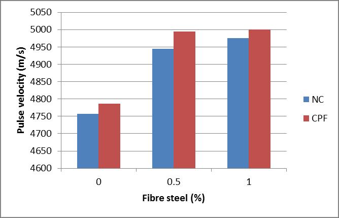 In Fig.13, the ultrasonic pulse velocities of normal concrete and CPF liner concrete at various steel fibre percentages are presented. When compared to conventional concrete, CPF liner concrete's ultrasonic pulse velocity increased by 0.6 percent, 1.0 percent, and 0.5percentfor(0%,0.5%percent,and1%),respectively.