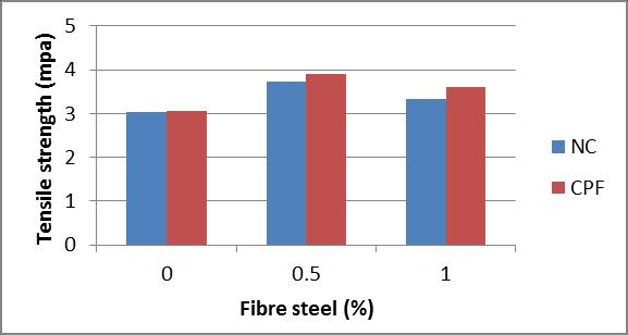In Fig.11 the split tensile strengths of conventional concrete and Controlled Permeable Form workliner concrete at differentsteel fibre percent is presented . Whencomparedtoordinaryconcrete,CPFlinerconcrete's splittensilestrengthincreasedby1.0percent,4.5percent, and 7.8 percent for (0 %, 0.5%, and 1%)percent, respectively.