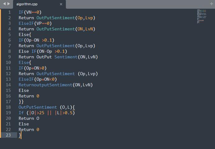 It represent Lvp and LvN overall very positive and very negativeinaline.TheoutputsentimentvalueofOp/ON and Lvp/LvNwhereVp,VN representtheverypositiveandvery negativeline.Insteadofloweringorraisinglinesentiment valuesby50%or100%,wheretheultimatenegationisgiven byONandSindicatesalexicalsentimentvalue.Theoutput sentimentfunctionverifiestheOP/ON andLvP/LvN values.It returnsthesentimentor0reliantonwhetherthecomplete value of thesentiment is >25 or the absolute value of the evidenceis>0.5.Ifthesharepostcontainsjustpositivelines, theultimatesentimentvalueisdeterminedsolelybyOP and LvP. The same thing happens if the message only contains negativeterms.Whenamessagehasbothverypositiveand verynegativeterms,itisclassifiedaseitherverypositiveor verynegative,reliantonwhichofthetwolinesisstronger.