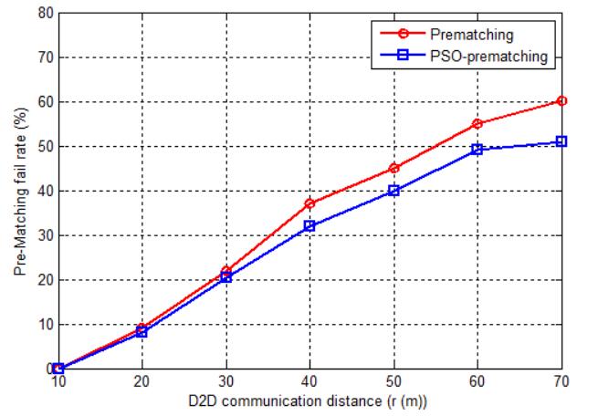 Fig2showsprematchingfailurerateincreasesfrom1%to 52%withlargedevice-to-devicecommunicationdistances rangingfrom10to70m.Whenthedistanceofthedeviceto device communicationimproves,the device todevicelink needs to increase the transmission power to get energy harvestconstraints,aftertherequiredtransmissionexceeds maximum power then, the device-to-device link cannot performSWIPTwhichwillincreasethenonenergyharvest device-to-devicelink,andwegethigherprematchingrate. InthePSOalgorithm,thepercentageofprematchingfailrate getsdecreaseswhileincreasingthenumberofD2Duser,as comparedtoprematchingalgorithm.Inprematchingthereis a restriction to select the energy harvest group and non energy harvest but in the PSO algorithm, we set all the receivesignalstoabitstreamthatisonly0and1,forthat we have taken an objective function. PSO will take informationaccordingtothebitstreamifthebitstreamis greaterthan0.5thenitwillberemovedfromtheselection matchinggroup andgroupedasanonharvestD2Dlink elseitwillharvesttheenergydenotedas