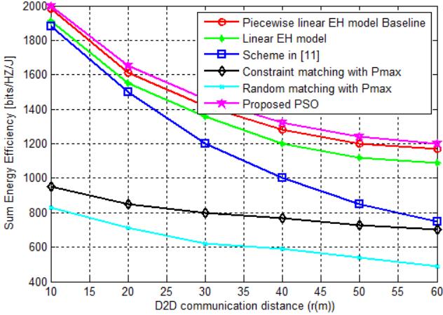 Fig4showsthesumenergyefficiencyversusdistanceofthe D2Dcommunication.Hereweanalyzethat,byusingthePSO algorithm the sum energy is increased with increasing of numberofD2Dlinkorcellularlink.