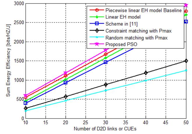 Fig-4:SumenergyefficiencyversusthenumberofD2D linkorCellularusersusingPSOalgorithm