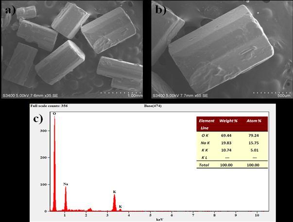 Fig.5 a)&b)aretheSEMimagesofRochellesaltmaterials andc)EDSofRochellesaltwithinsertedtableofdifferent weightandatomicpercentage.