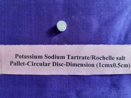 The Rochelle salt powder sample is weighed of 0.1 gram, individual samples are grinded the by using pestle and mortar.Transferthegrindedsampletothepalletsetup.The setupwasassembledtightlywithinstrument.Thepressure of 15 Kg/cm2 is applied to pallet equipment. The applied pressureismaintainedfor2-4minutes.Finallythepressure was released manually and circular pallets are collected frompalletsetasshownintheFig-2.ThepalletsofRochelle saltelementsispreparedinordertoperformmorphological studies,electricalbehaviorstudies.