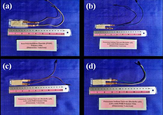 Laterthechemicalprecipitationsolutionisheatedwithhigh temperature.Infurtherstage,magneticsteerprocedureis carriedoutandsetthetemperatureupto70˚-100˚Coreven above.HencethePVDFbasedRochellesaltcompositewith different percentages is carried out. To fabricate the electrode(silverpaste),theas-preparedRochellesaltbased PVDFcompositefilminitiallyitwascarefullycutinto7cmx 3 cm dimensions and the silver gel was uniformly coated usingthedoctorblademethod.Asmallpieceofconductive adhesive copper tape was attached over the composite, whichbehaveslikepositiveandnegativeterminalsasshown inthefig-1