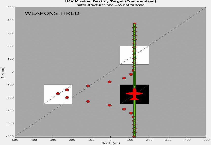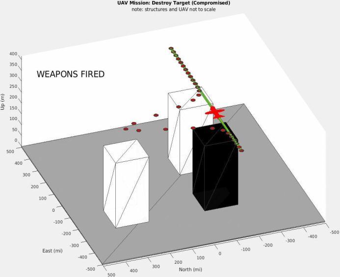 Matlab code is located that may be used to run the simulationoftheChapter-01scenario.InFigures4and5,we see the instant the UAV shoots against the target (the structure outlined in black) from a circling perspective in Figure-4 and a birds-eye perspective in Figure 5. The unmannedaerialvehicle(UAV)ishoveringrightabovethe target,andtheredGPScoordinatesestablishedbeforehand indicate that the payload will actually reach the target. Figures6and7depicttheinclusionofaGaussianTrojanasa supply-chainembeddedassaulttotheguidedmissiles'GPS readings from comparable perspectives. This allows the systemtofirethepayloadonafreshtargetlocated400miles distantaftertheUAV'sGPSreadinghasalreadytransmitted thefireinstruction.Byextendingthissituationbyanother degreeoflongitude,thedistancewouldincreaseto60miles (calculatedusing[7]).